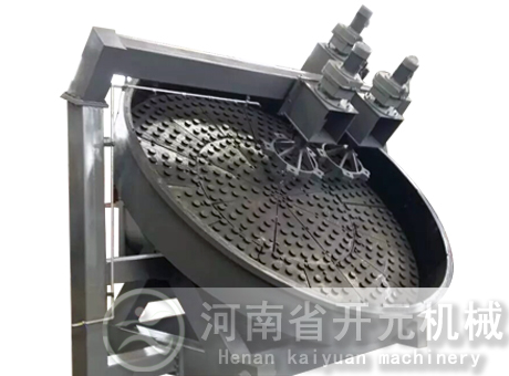 圓盤造粒機是有機肥行業(yè)的常用設(shè)備之一,一般適用于中、低濃度,小規(guī)模的生產(chǎn),成球盤調(diào)整到40°-55°之間。由電機減速機帶動齒輪從而加入混配好的原料肥。由于粉肥和圓盤旋轉(zhuǎn)而上升,又在重力的作用下向下滾動,在以上幾種力的作用下,盤內(nèi)物料逐漸形成基核直至達到成品顆粒,由圓盤邊溢出。本機具有成球率高、顆粒圓潤、強度大、防腐、操作直觀、維修方便等特點。